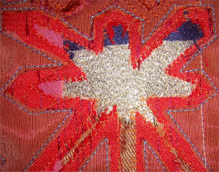 This time I decided to combine four star shapes using the idea that I would distort them and create a larger square.I used a blue background and laid pieces of my fabrics at random then covered the lot with a two sided furnishing fabric.I stitched around the shapes from the back in blue,then from front in orange.I cut between these lines to expose underlayer of furnishing fabric on all four stars.Next I cut back three stars inside the orange stitching to expose the fabric variety.On the last star I stitched outside the shape and cut and frayed the edges.This is a much more interesting sample than the other two because of the surprise factor as to what is revealed.I also like the way the furnishing fabric reveals its two ccoulours when frayed.